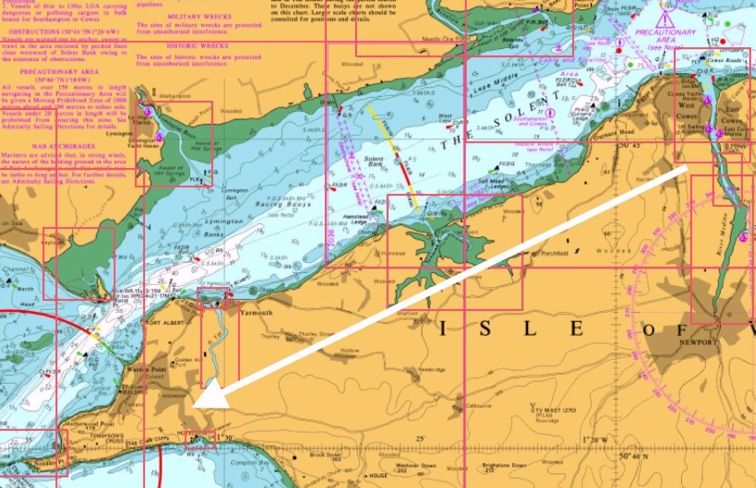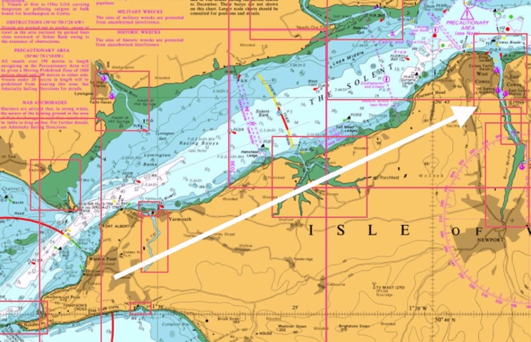 Courant contraire : Suivez la côte anglaise si vous revenez de SALT MEAD ou HAMSTEAD LEDGE vers COWES.N’hésitez pas à empanner souvent pour suivre la côte.