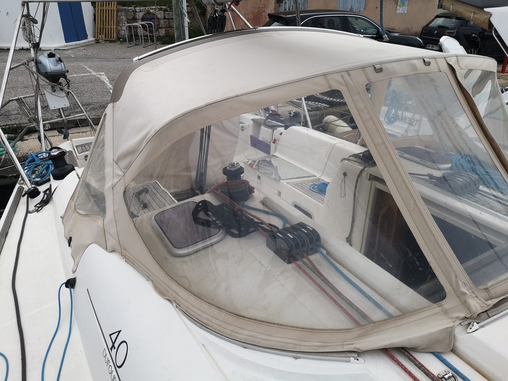 Capote de roof NV équipement pour Dufour 40,fermetures éclair, tissus,cristal le tout en très bon état, couleur beige, fenêtre centrale ouvrante, poches latérales. Je la vends car j'ai changé la couleur de la garde-robe de mon bateau en une autre couleur. La valeur neuve chez NV de ce modèle est de plus de 2000€