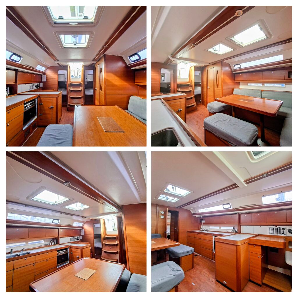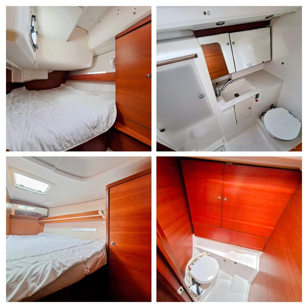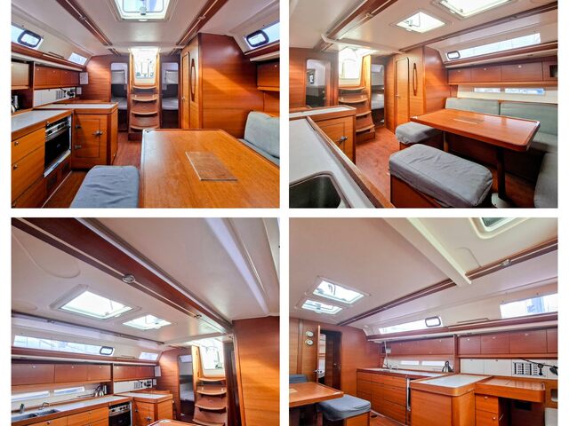 Les aménagements sont modernes, avec deux belles cabines arrières, et deux cabines doubles à l'avant, ainsi que 3 salles d'eau avec eau chaude: 1 WC et 1 douche séparée, et 1 combinée avec douche à part. Deux familles avec enfants peuvent passer une semaine agréable sans contraintes. Le carré permet d'assoir tout le monde, et la grande cuisine de régaler l'équipage.