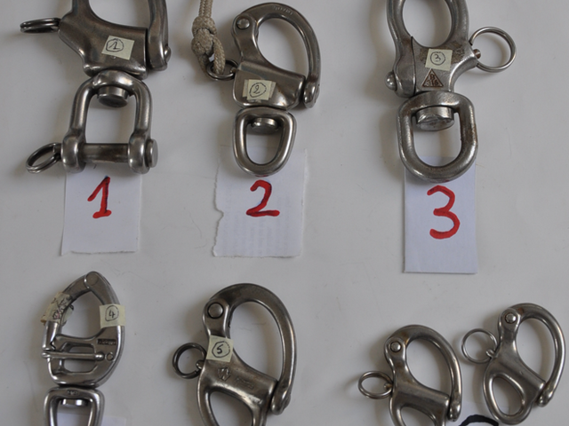 - No1 : Mousqueton de drisse émerillon manille. Longueur 120mm . Charge 2400/7000kg. 75€.