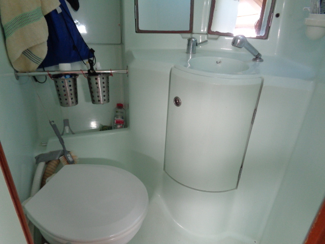 Salle de bain comprenant un WC marin, lavabo, douche eau chaude/froide sous pression