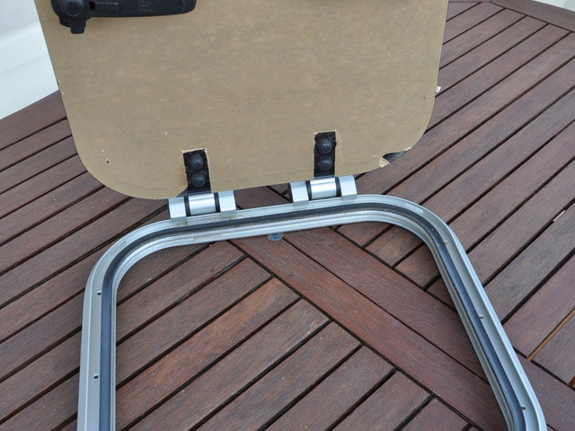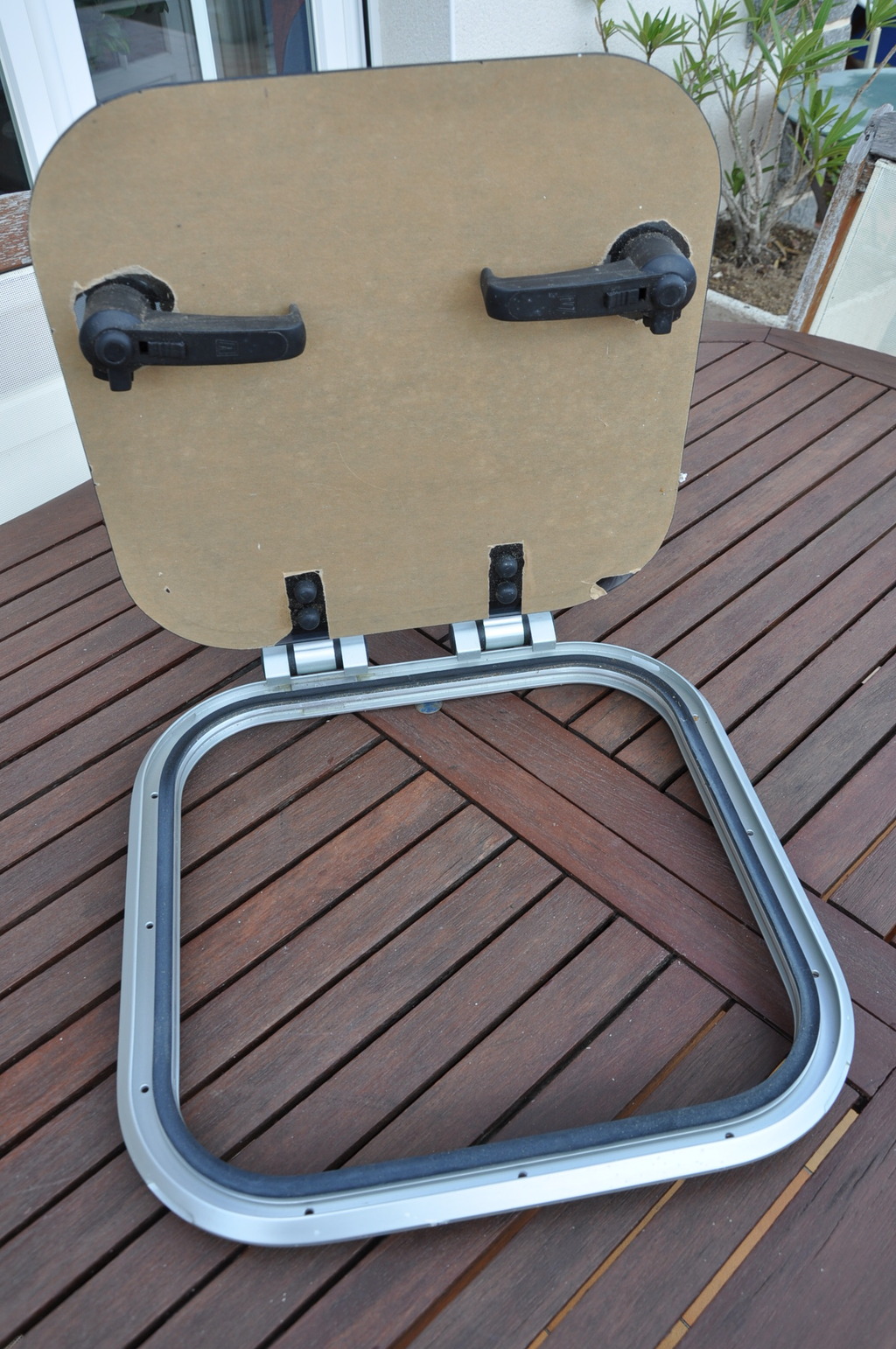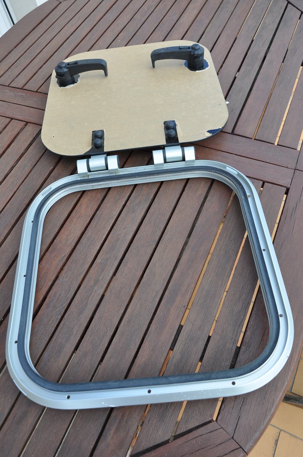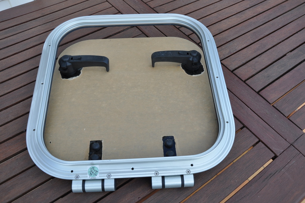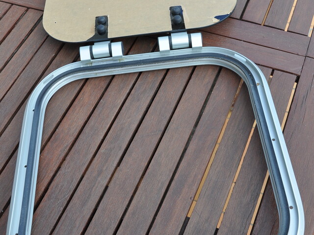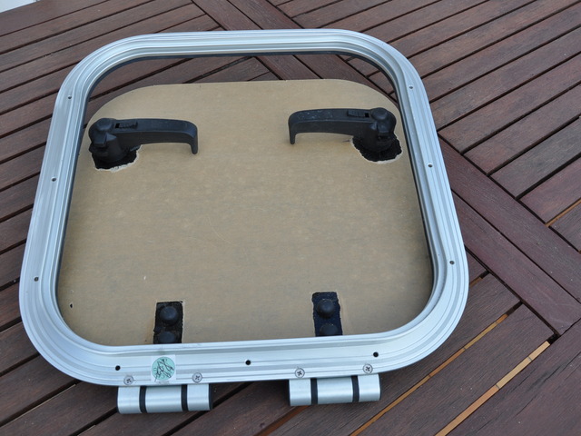 Panneau de pont ouvrant VETUS PLAS - 4040. Aluminium anodisé. 2 poignées. Dimensions hors tout : 424mmx424mm. Couvercle en acrylique fumé de 10mm ( 395mmx395mm ). Charnière à friction. Ouverture n'importe quel angle jusqu'à 180°. Matériel neuf (valeur 320€). Poids:3,100kg.