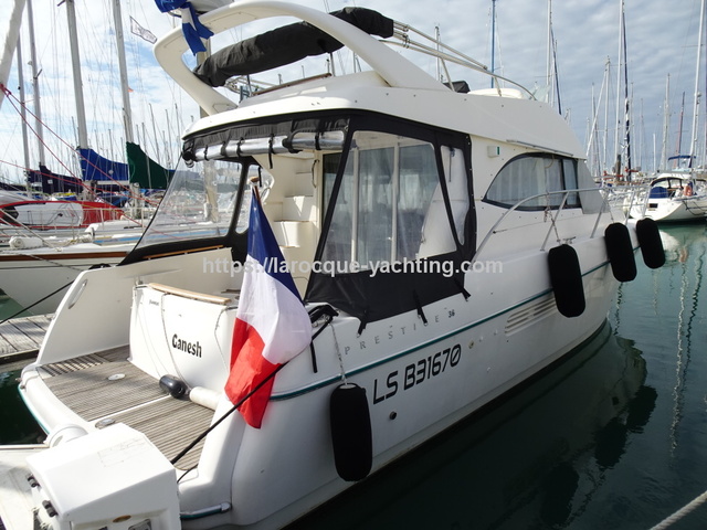PRESTIGE 36. Superbe unité, parfaitement entretenu. Très gros investissement financier depuis 2022. Moteurs In-bord Volvo KAMD44 de 2*360 cv comptant 1 050 heures de fonctionnement, entièrement révisés en 2022. Propulseur d’étrave. Sellerie en parfait état. Vernis en parfait état. Bain de soleil avant. Bain de soleil au fly. Taud de camping sur mesure. GPS traceur Garmin aux deux postes de pilotage. VHF ASN. Chauffage air pulsé. Climatisation. Bateau qui a bénéficié de très nombreuses améliorations. Visible à La Rochelle. Pour plus d’infos, photos ou organiser une visite, contactez-moi sans attendre !