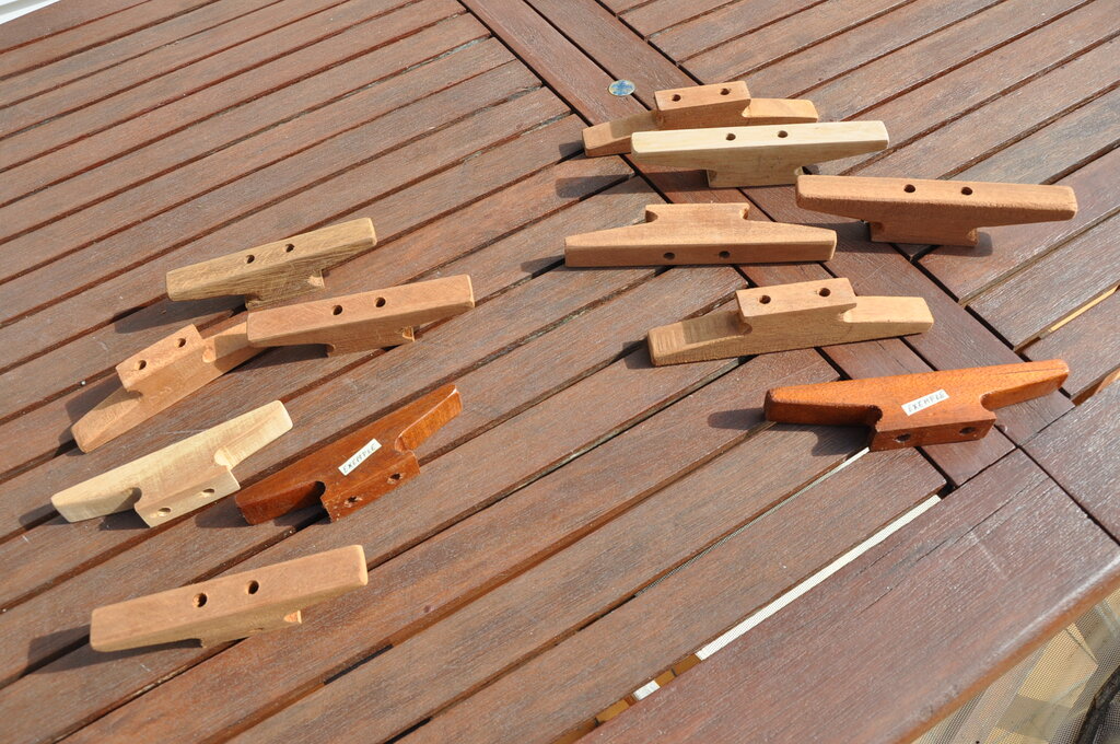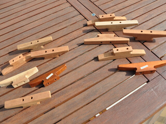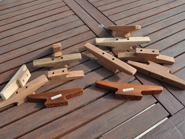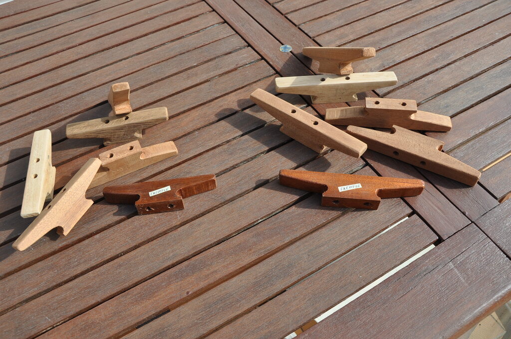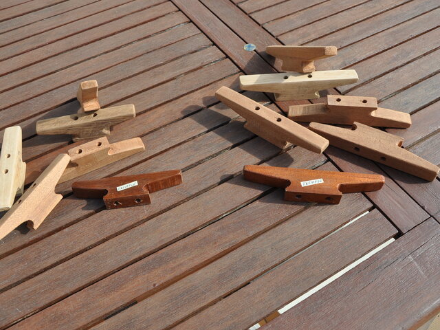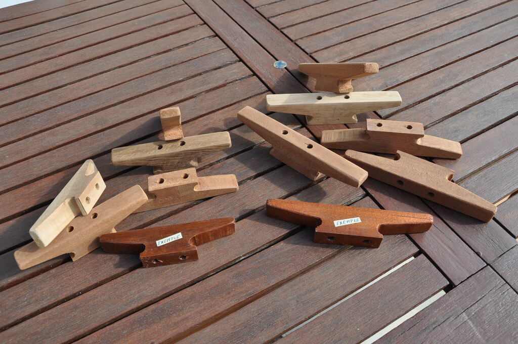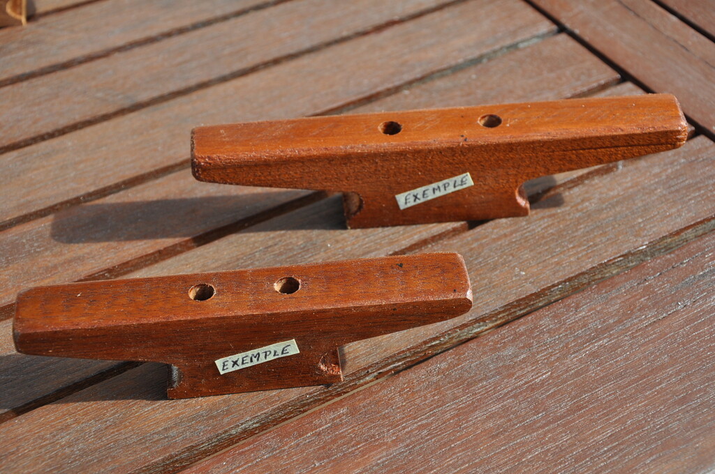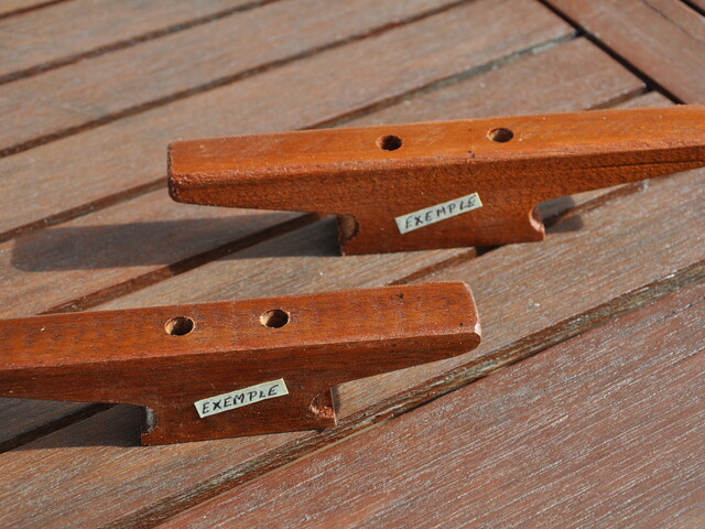 Taquets en bois rouge ou blanc fabriqués au départ pour un vieux gréement. Les taquets sont neufs et volontairement laissés à l'état brut , à peindre ou à vernir (voir exemples). 2 séries disponibles : 1) Longueur 145 mm , largeur 22mm , hauteur 35mm ,trous 6mm ,entraxe 27mm ( 8€ pièce ). 2) Longueur 180mm , largeur 22mm , hauteur 38mm, trous 6mm , entraxe 37mm (10€ pièce ).