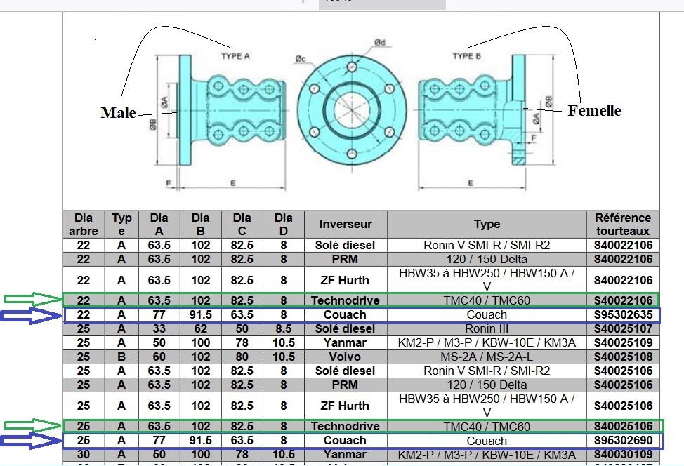 Il faudrait connaître le diamétre de l'arbre, et savoir si toute la ligne d'arbre est un montage Couach...