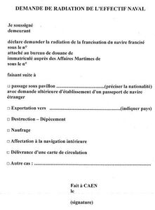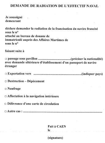 • Le vendeur doit remplir une demande de radiation du pavillon francais exportation vers .... avec :