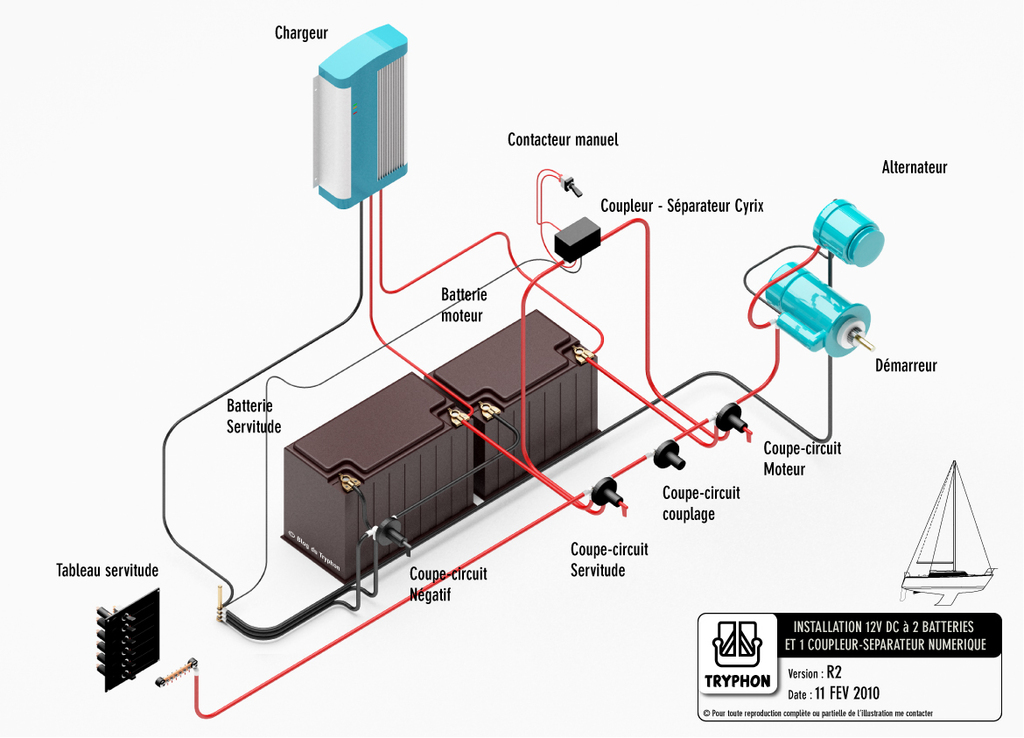 Tu veux voir aussi la possibilité de permuter les batteries en cas de décharges de l'une d'elle...Cela veut-il sous entendre que tu resteras plusieurs jours en mer ?