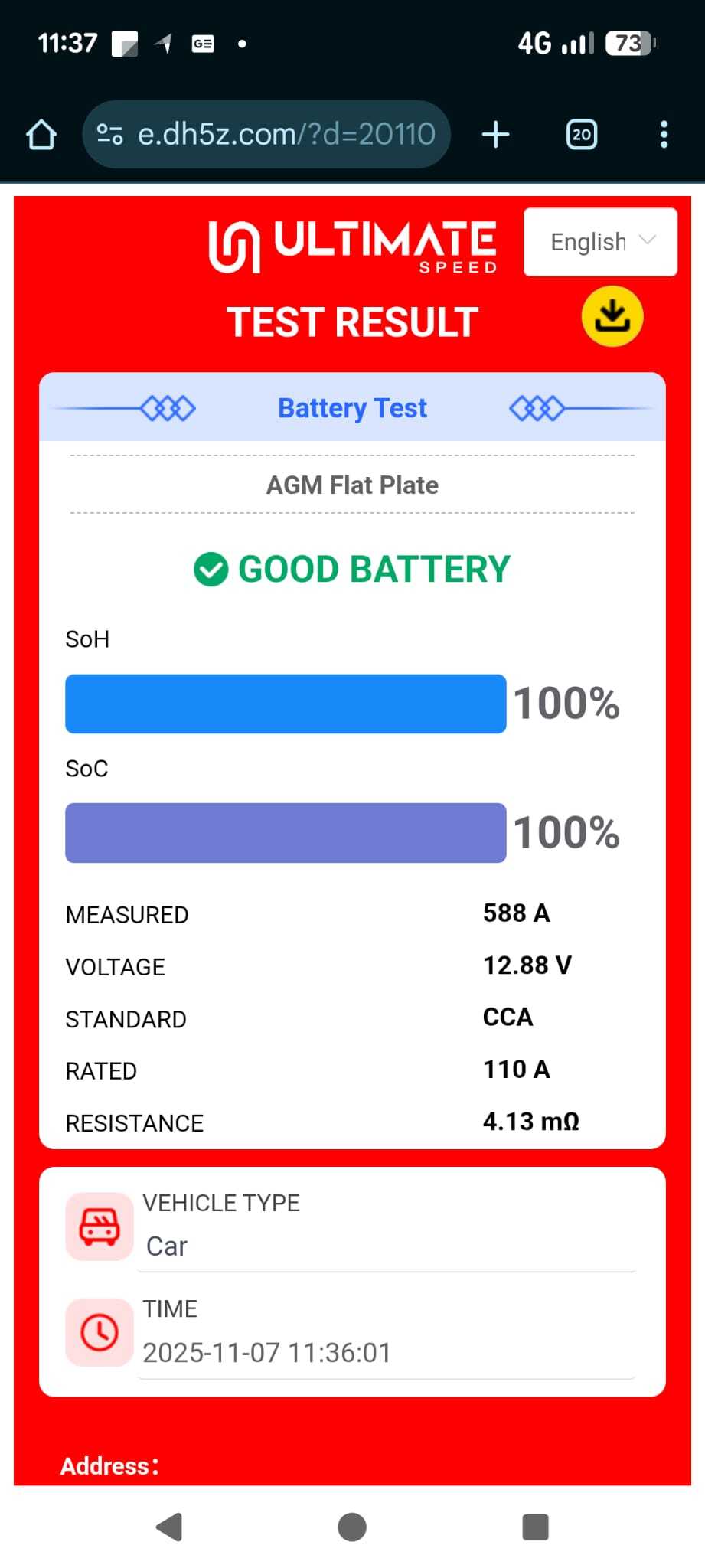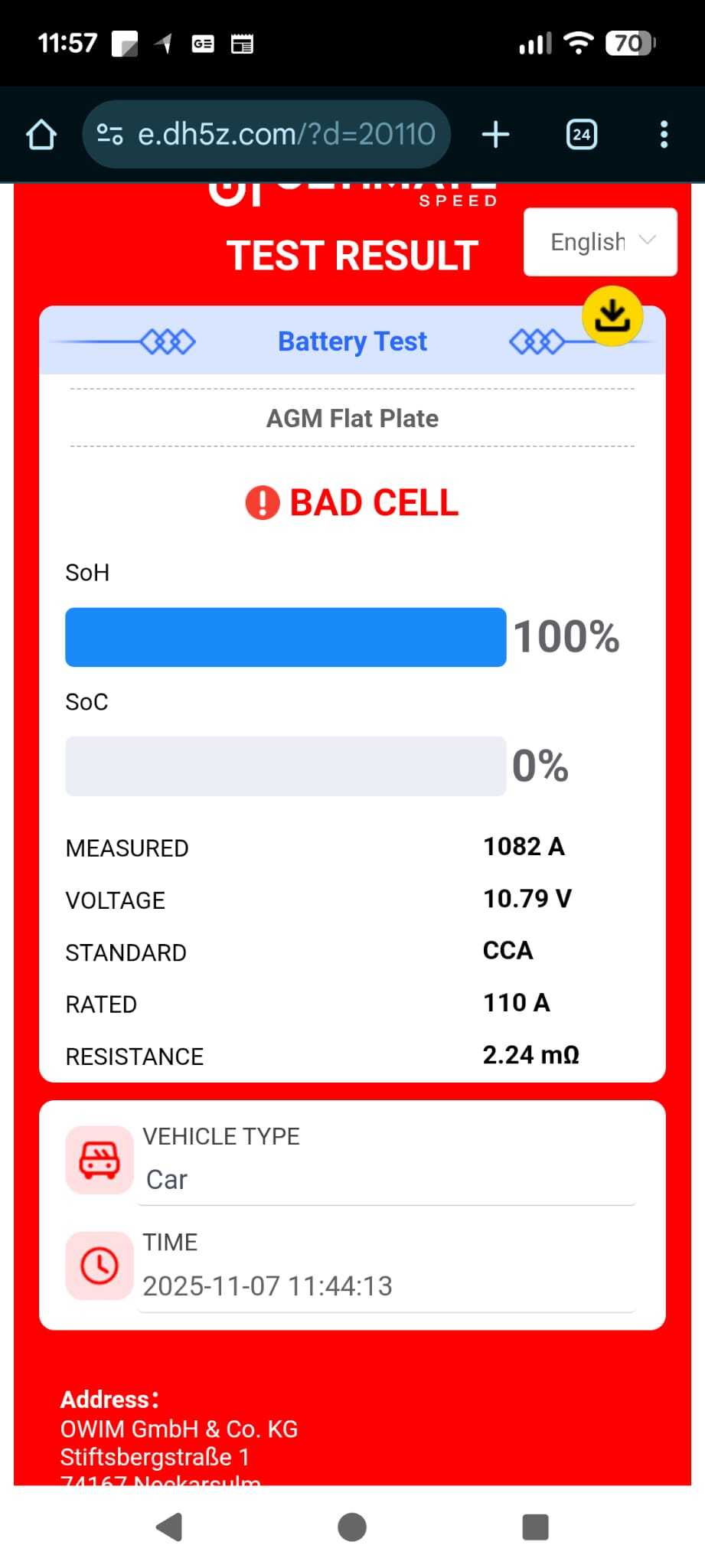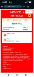 J'ai bien entendu testé la batterie, elle a l'air bonne, je vous joint des captures d'écran d'un test avec un testeur lidl. Elle a 12.88v au repos et descend a 10.22v en charge avec 1082 cca.