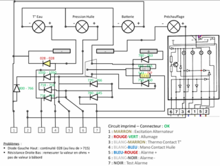 • Test de continuité + chute de tension sur le fil marron reliant la sortie D+/61 de l'alternateur au circuit imprimé du tableau de bord => OK