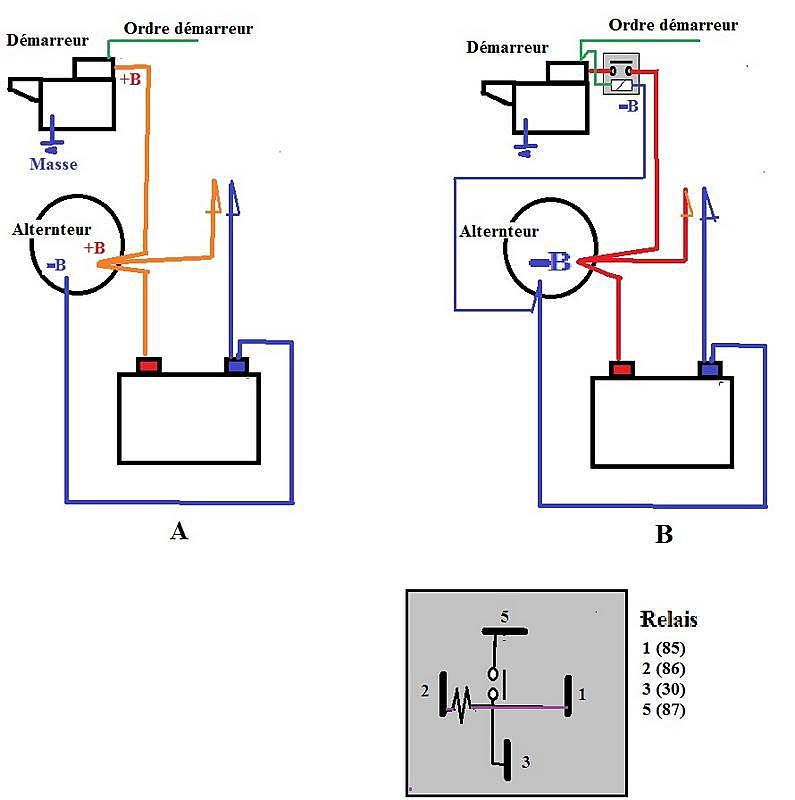 A : schema normal d'un moteur avec démarreur non isolé de la masse et polarité+B en permanence sur le démarreur