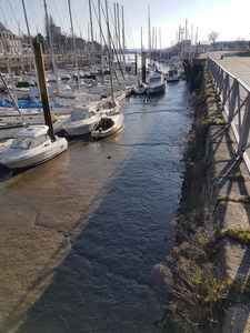 Lorient grande marée, pontons ( alu et béton ) et bateaux sur la vase ( qui pue, remuée par les bateaux bus ), passerelle en grande pente, quai béton et pontons posés en dévers, catway tiré par les aussières, passerelles neuves entre docks béton trop courtes et en chapeau de gendarme...