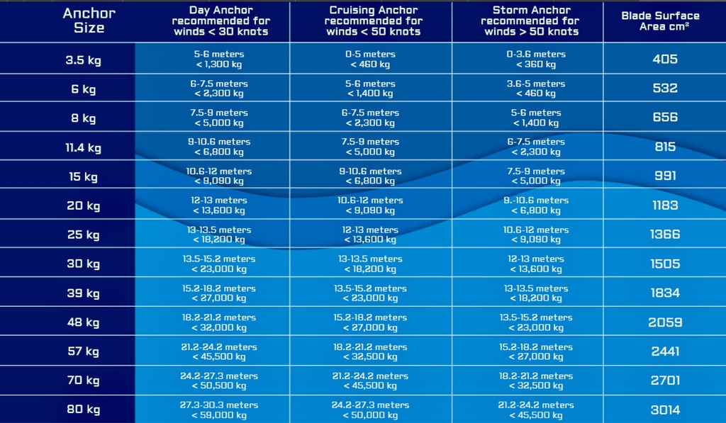 Pour les tailles inférieures à 12m, le tableau Lewmar correspond à peu près à la colonne "Day anchor" de Mantus.
