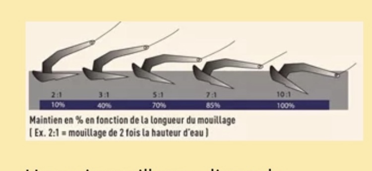Jolly.rodjer:La différence c’est que dans ta tableau il y a une ancre au bout .Quand le bateau tire fort sur l’ancre la chaîne est tendue . Le pourcentage de résistance en fonction du rapport longueur ligne mouillage / hauteur d’eau déternité une angulaton qui permet à l’ancre de plus ou moins bien travaillé ·le 01 oct. 14:06
