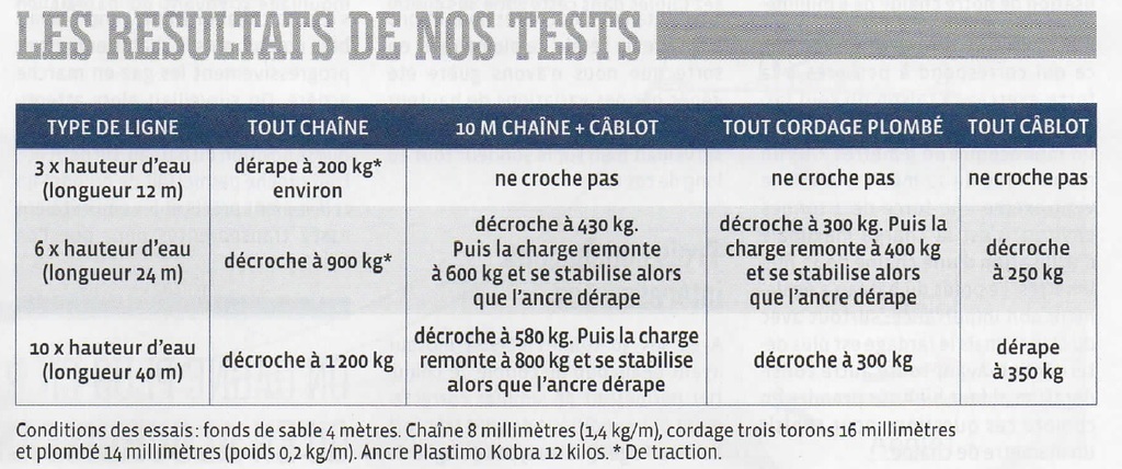 40 mètres de chaîne pour un mouillage de 4 m, apporte déjà 1200 kg de résistance, AVEC une ancre Kobra de 12kg. Et c'est déjà énorme car d'après ce , un voilier de 10 mètres qui essuie 40 noeuds de vent, ne tire que 800 kg.