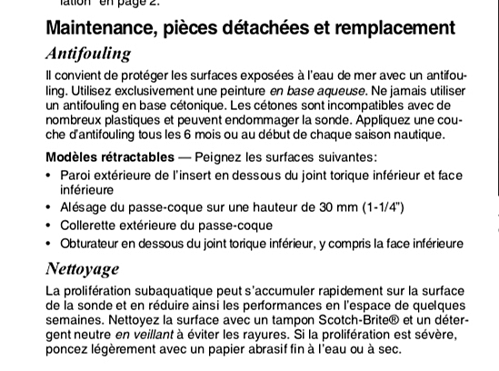Nous sommes en train de faire le carénage du bateau et nous nous posons une question. Peut on mettre de l'antifouling sur la sonde de profondeur. Si oui dans quelles conditions (produits interdits, préparation, nombre de couches)? et se peut il que l'on observe une pertes de précision ou autre artefacts du fait de la présence d'antifouling sur la sonde?