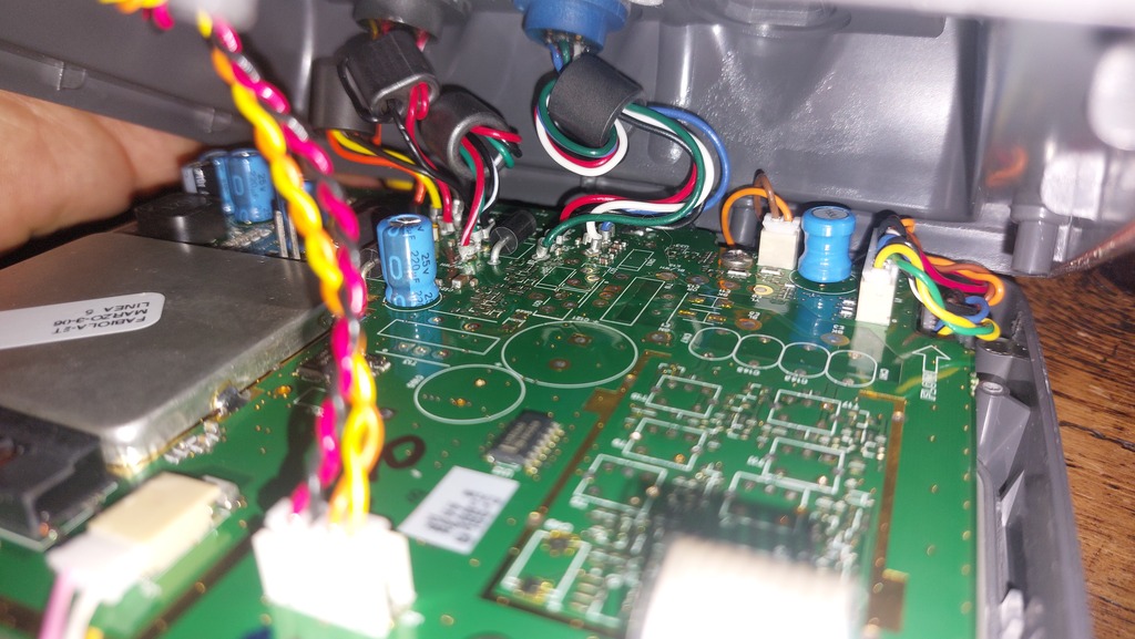 Arno voici quelques photos, si tu arrives à déceler quelquechose. Je ne vois pas trop comment le stimuler hormis le secouer un peu ( mes connaissances electroniques sont comme tu vois assez... sommaires). J ai observé les composants et ne vois rien d anormal
