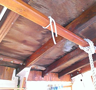 Le contreplaqué, sous les lattes de teck, ainsi noirci par l'humidité, c'est mauvais signe. Il est à peu près certain que la partie teck n'est plus étanche au niveau des fixations sur les barrots.