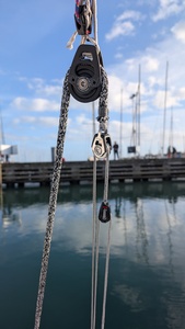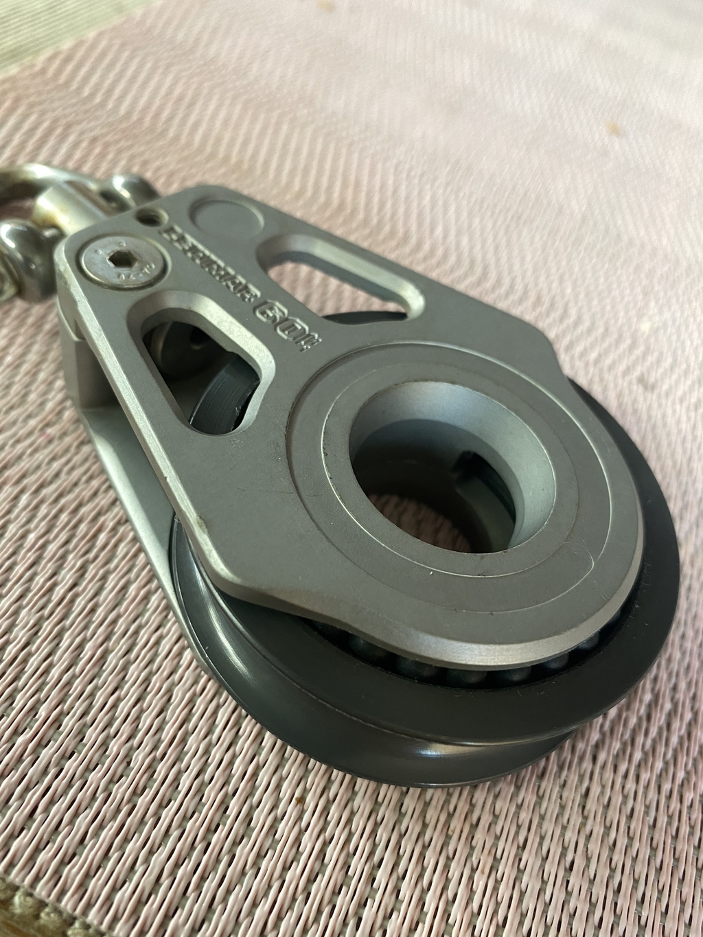 La première poulie est une Antal OPF50 à sangler (MWL 600 Kg), la deuxième une Allen 2030HL (MWL 300 Kg) et la 3ème une Ronstan Orbit 20 (MWL 200 kg).