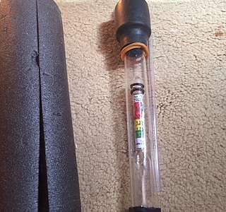 C'est un pèse acide, c'était utilisé avec les batterie au plomb ouverte (avec un bouchon pour remettre de l'eau déminéralisée). Je doute que les tiennes soient encore de ce type, mais si c'est le cas, tu plonges le pèse acide dans le liquide, tu pompes avec la partie en caoutchouc pour le remplir, et tu regarde si le niveau d'acide fait monter le plongeur jusqu'au niveau vert ! Si oui, ta batterie est bien chargée, si non, tu recharges et tu recommences la pesée en faisant très attention aux gouttes d'acide et aux projections qui causent de graves brulures [tablier gants et lunettes obligatoires] !