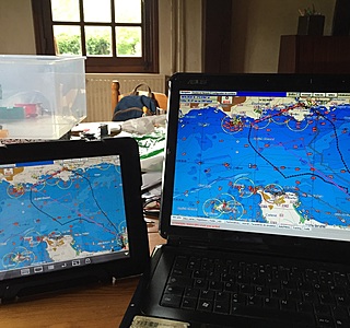 Ainsi j ai la cartographie de mon PC envoyée sur l IPad, si je ne neutralise pas l écran tactile je peux déplacer du doigt la flèche de ma souris sur l iPad et clicker sur le bouton MOB de Noe, qui figure en gros et en rouge en haut sur la carte.