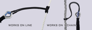 Bonjour, la solution est le neud de prusik avec un bouts à deux œillets, sur le câblot trois tours .. l’image est parlante. La pâte d’oie DOIT partir depuis la pointe des flotteurs, le mieux étant de disposer des chaumards sur les pointes et de frapper la patte sur des taquets situés sur les bords ( + de longueur = plus d’élasticité ). Le bout principal ou la chaîne doit être en pendille = mou c’est la patte d’oie qui seule doit travailler. Ce qui fait que son fixation n’est pas sollicité. L’angle formée par la pâte d’oie doit rester à peu près à 60° .