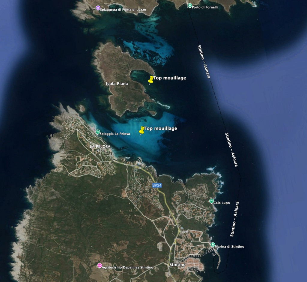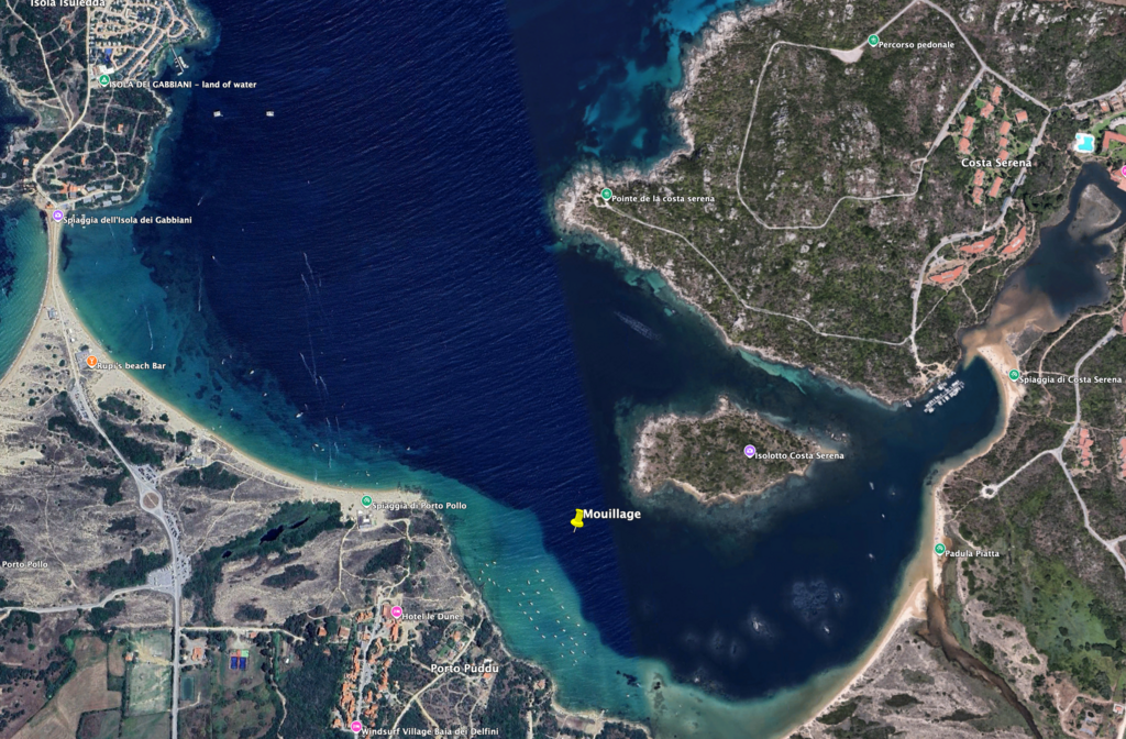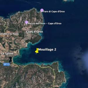 Sinon pleins de mouillage sur la cote, il suffit de regarder la carte entre Olbia et Le nord, la cote est très découpée et au nord Ouest il y a le très beau mouillage entre l'ile de Piana et la côte ou on mouille dans une piscine d'eau cristalline avec 3m de fond ...