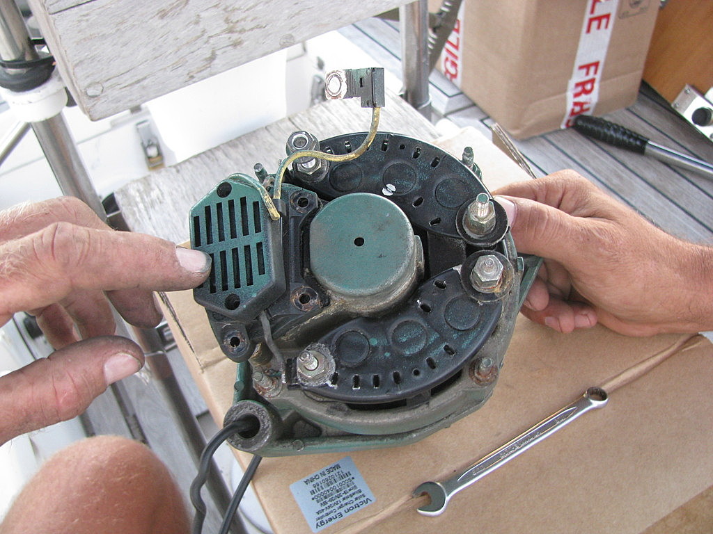 Un Hitachi de 35A sûrement d'origine (1984) pour 70Ah moteur et 110AhX2 de servitudes plomb-calcium.