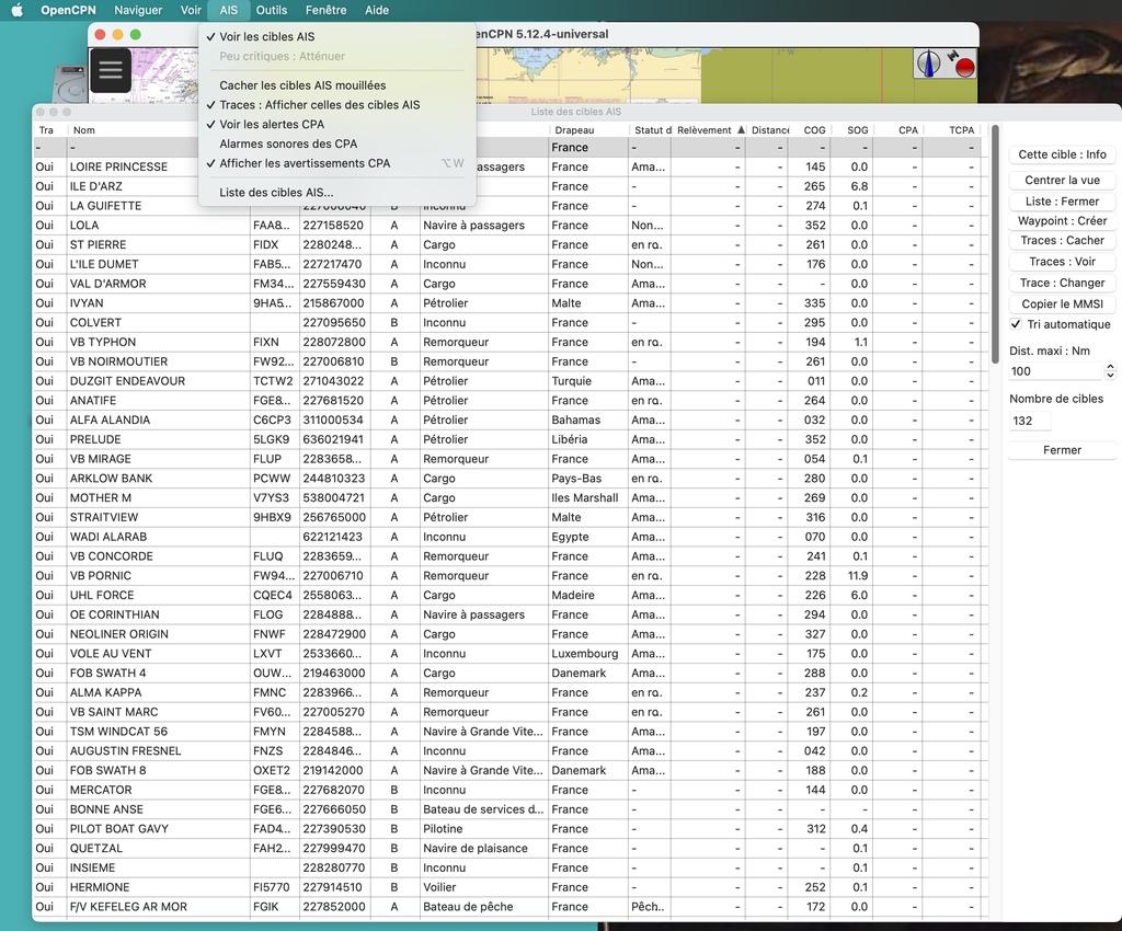 Dans mon cas j'ai 132 cibles AIS sur iMac et tablette Blackview Mega 3 avec OpenCPN 5.12.4 sur une distance maxi fixéed à 100 milles