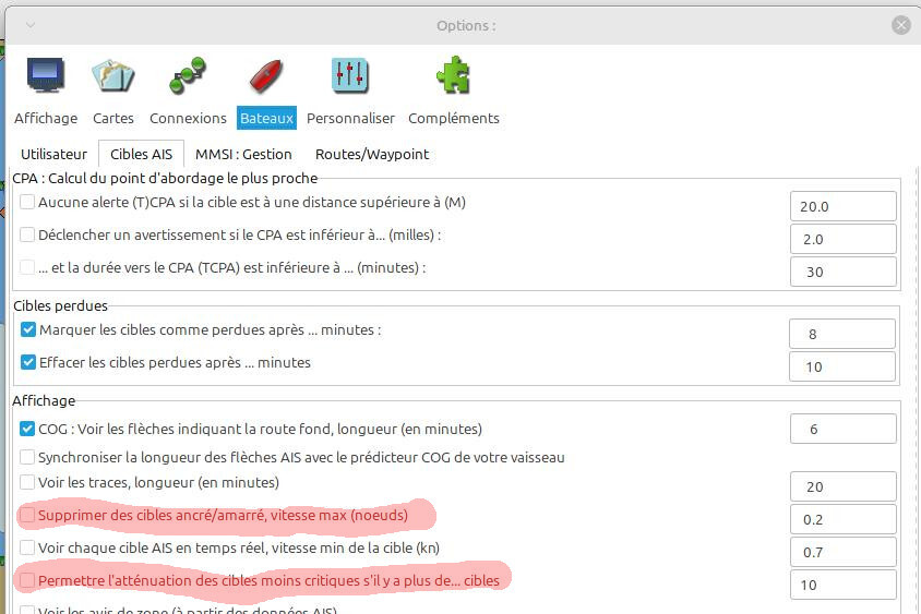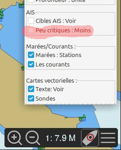 Peut-être à vérifier, dans OpenCPN deux endroits où il est possible de diminuer le nombre de cibles AIS visibles.