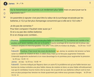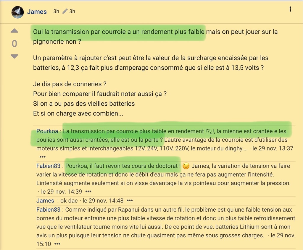 Pourkoa:La transmission par courroie plus faible en rendement !?¿!, la mienne est crantée e les poulies sont aussi crantées, elle est ou la perte ? L’autre avantage de la courroie est d’utiliser des moteurs simples et interchangeables 12V, 24V, 110V, 220V, le moteur du dinghy….·le 29 nov. 13:37