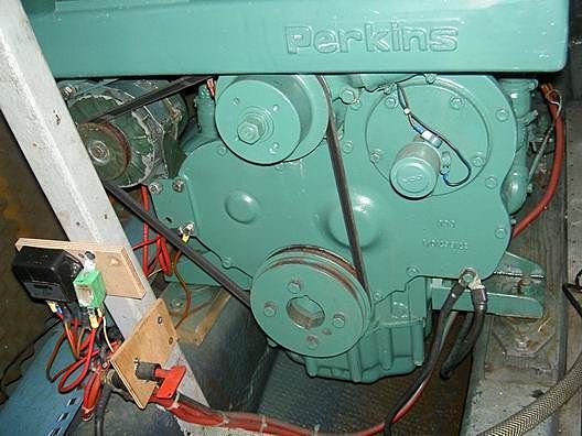 J'ai même démonté la plaque et il n'y a aucun arbre sur lequel je pourrais monter un tachymètre. Donc, la prise se fait sur le W d'un alternateur et utilise ensuite le compte tours Perkins d'origine.