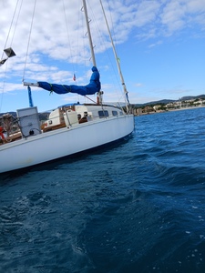 je l'ai fait passer dans toutes sortes de mers, sans trop écouter la météo, comme je le faisais il y a 20 ans..Avec un bon accastillage, je ferais sans hésiter de grandes croisières avec ce bateau qu'il n'y a jamais besoin de barrer jusqu'au vent de travers, et qui tient très bien à l'échouage.. Il vaut mieux prévoir un spi pour le petit temps..