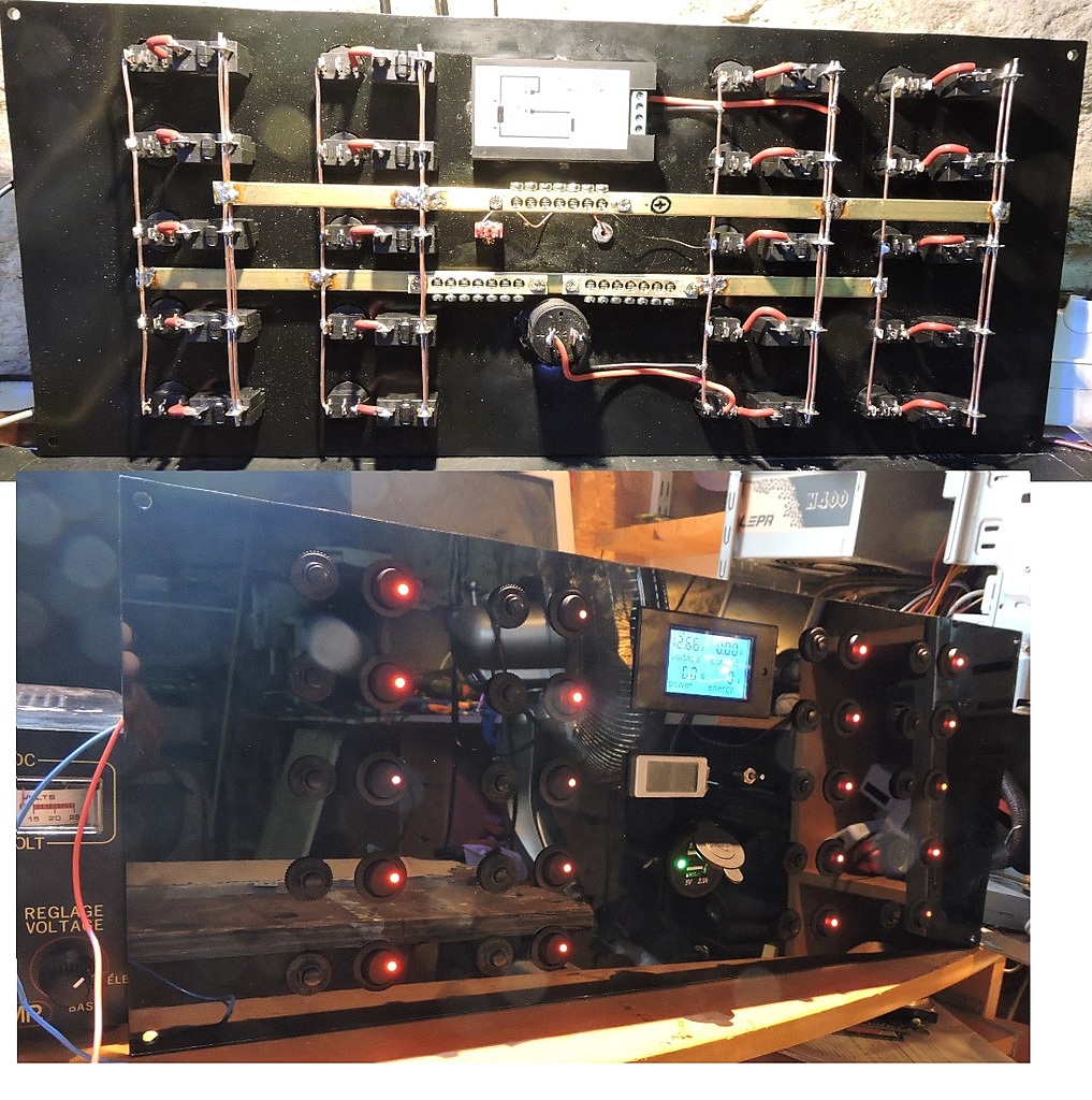 Volontairement je n'ai pas voulu associer le réseau 220 V et la partie Moteur sur le tableau, pour moi le 220 V c'est complètement à part, les commandes moteur accessible depuis le cockpit et coupe circuit sur les deux batteries (moteur et servitude).