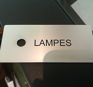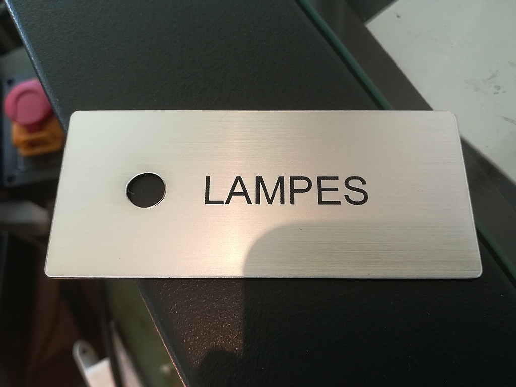 Possible aussi de graver avec une Co2 une plaque en alu anodisé noir la gravure sortira blanche mais il faudra usiner les trous car la Co2 ne découpe pas le métal.