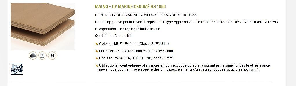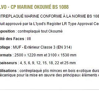Il y'a des normes par pays, mais la plus utilisé est la BS (british standard)et ASTM chez les ricains, en France c'est souvent les normes BS qu'on applique, bien que le respect d'une norme ne soit pas obligatoire. Et on peut se retrouver avec du CP Marine dont les placages cassent quand on lui donne une forme. D'où l'importance d'acheter du BS1088 quand on bosse avec les bateaux, ou bien placage acajou aussi sont très utilisés pour construire des coques en bois moulé. Sinon je conseil très fortement le CP marin bruynzeel ou joubert.