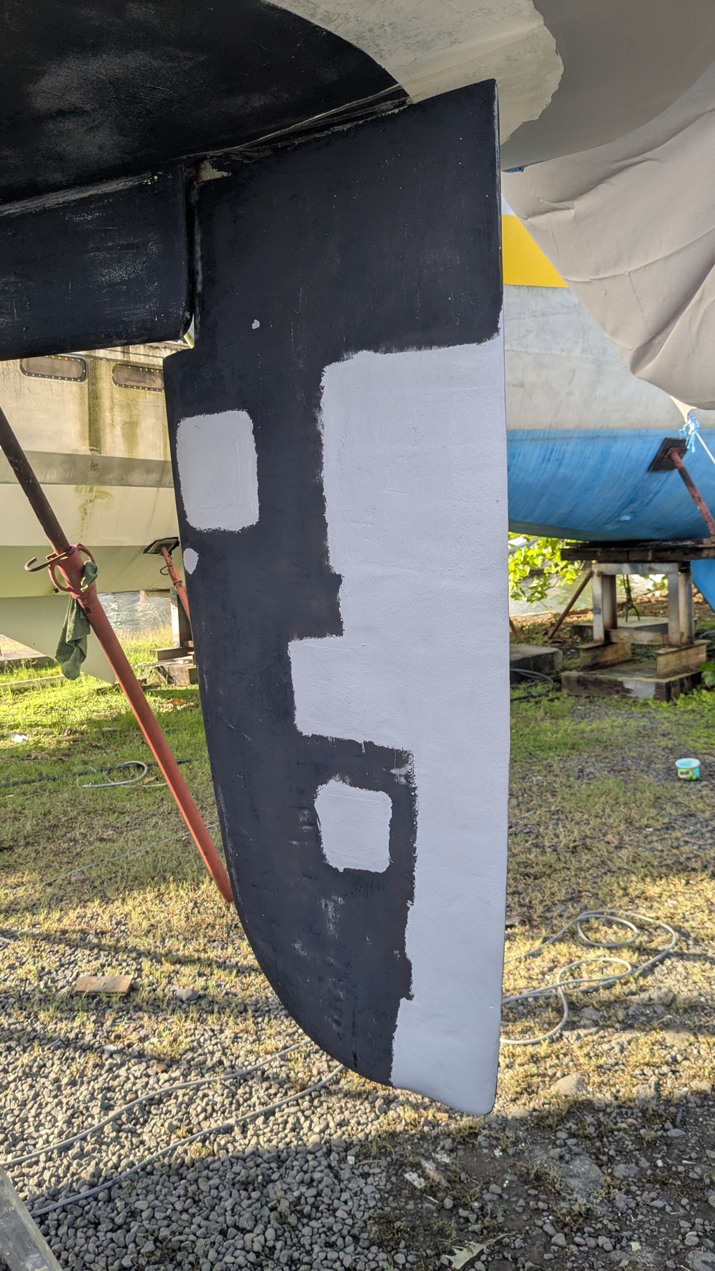Quand tu remonteras ton safran, je te suggère de mettre une petite virgule fixer à la coque pour éviter qu’un cordage ou une algue ne vienne se coincer entre la pelle et la coque.