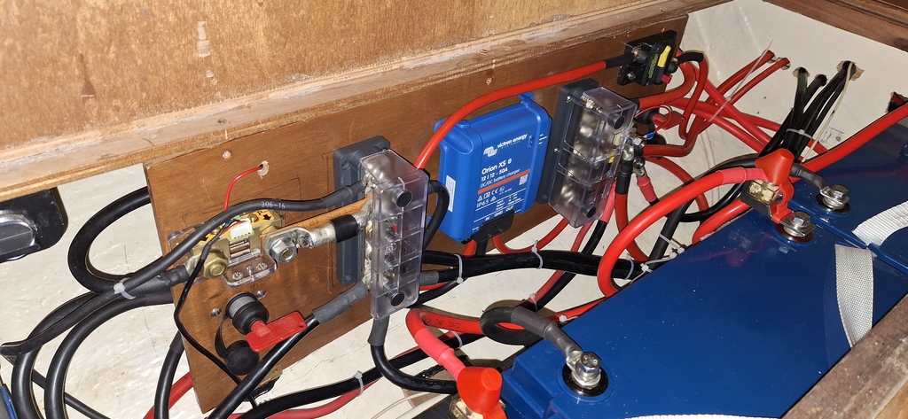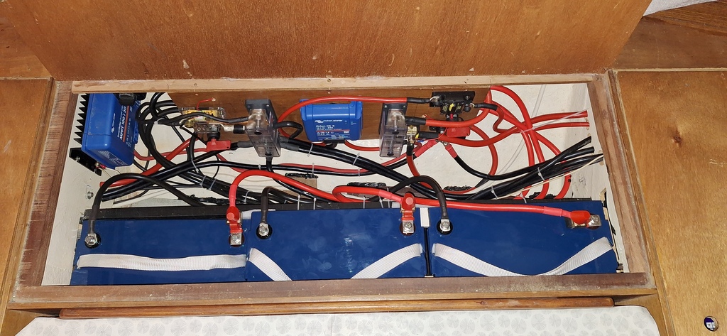 Sur mon bateau la batterie moteur et une des deux batteries de service sont à fond de cale sous l'escalier. J'envisage de refaire proprement cette zone (câbles qui passent dans tous les sens, cosses empilées, quelques dominos et j'en passe)