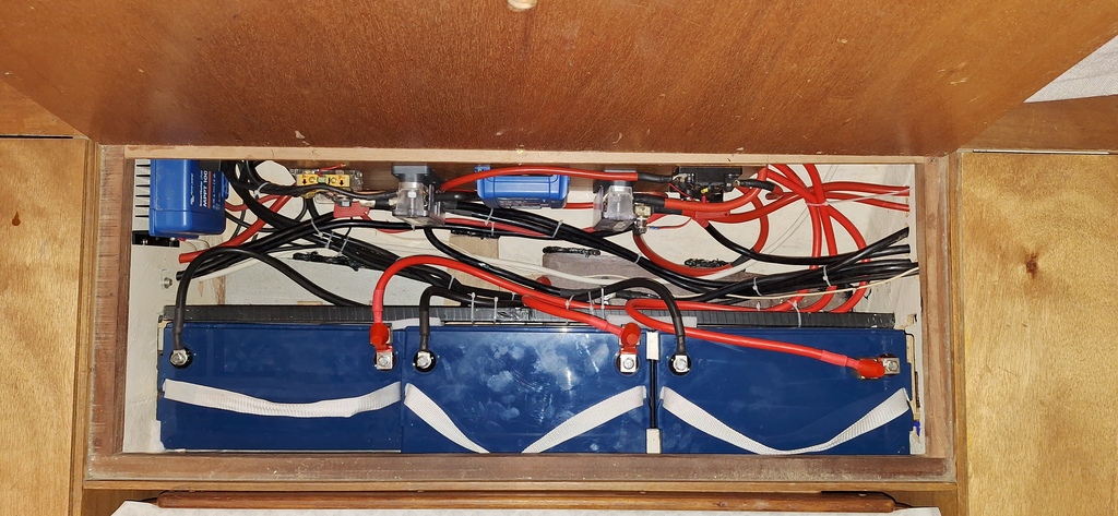 Et on voulait garder du stockage et l'accès facile a la trape moteur de la cabine bâbord... Ceci dit des bon amis ont installé leur Parc batterie là où tu le souhaites sans soucis , ... Faut juste les démonter si ils veulent acceder aa l'alternateur etc...