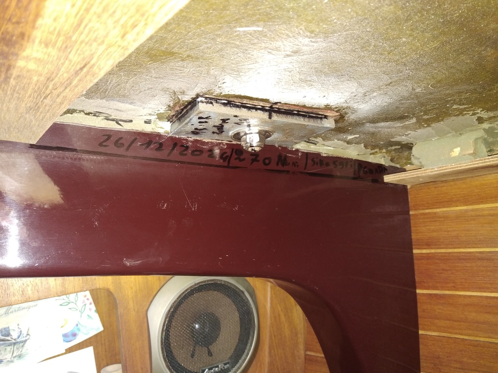 Je pense que la plaque de renfort changée ( en photo) à été changée par un précédent propriétaire qui a souqué sur les boulons. Au fil des mois une petite déformation du pont a favorisé une micro fuite dans le pont et engendré le délaminage constaté autour des cadènes.