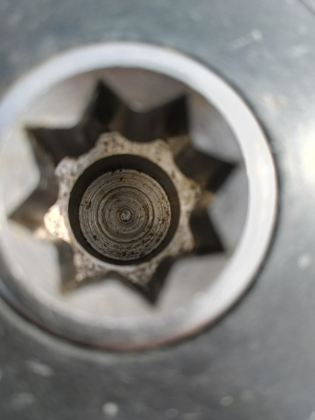 ya une vis au fond de la cloche de poignée, elle peut être cachée par, soit un amas de saleté, soit un cache amovible