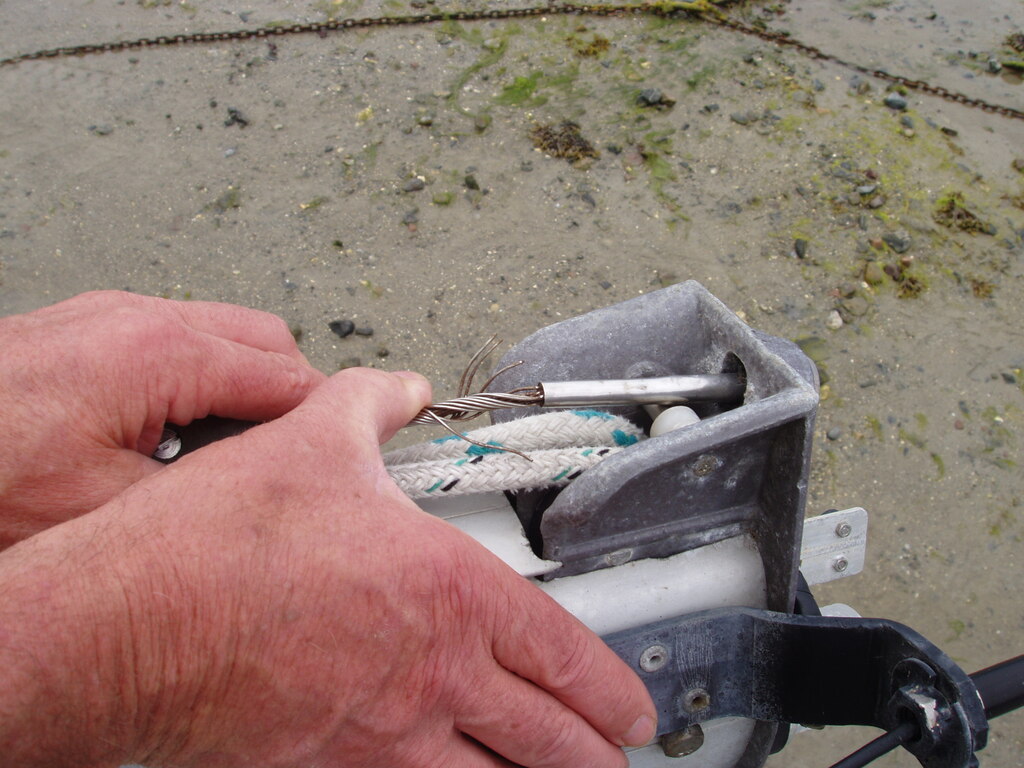 Après changement d'étai, j'ai fixé une petite poulie sur le mât pour changer l'angle de traction.
