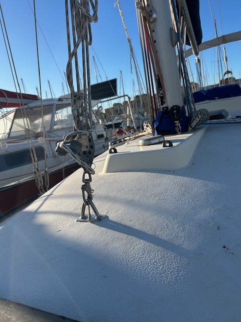 Sur le x 43, j'ai une cadène en arrière de la bail a mouillage qui sert a fixer le hale bas de tangon (je pense? mais j'ai pas de tangon).