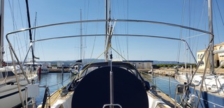 Ce dimanche, enfin une belle journée et malheureusement coincés au port pour bricoler, on a pu profiter de notre grand taud. Il est d'ENFER !