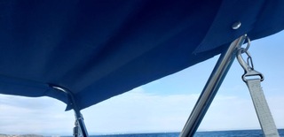 J'ai acheté chez Discount nautic un bimini alu pour 130 €, et je leur ai acheté aussi toutes les rotules en inox pour 60 €. Parce que, la seule chose qui est fragile sur les biminis pas chers en alu, c'est les rotules en plastoc, qui sont vraiment merdiques et fragiles.