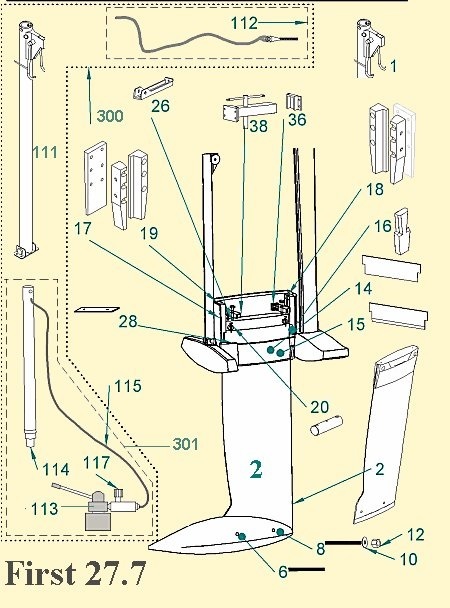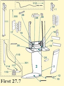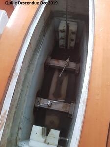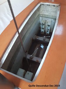 Voici un éclaté avec toutes les pièces et des photos du puits de quille, on voit les barres de blocage de la quille en position basse et les glissières de guidage à l'avant et à l'arrière.