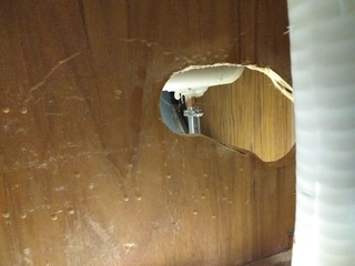 Pour l'évacuation de la glacière/ frigo, j'ai préféré alléger la cloison que de tout démonter ! Si je dois y retourner c'est facile ! On peut percer avec une scie cloche, il y a la place derrière. D'ailleurs j'en ferais bien quelque chose de toute cette place ...