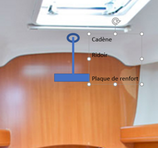 C'était fait quand j'ai acheter le bateau. Je n'ai pas de photo mais c'est assez simple une cadène sur le pont, une plaque de renfort boulonné dans la cloison entre la baille de mouillage et la cabine, un ridoir entre les deux. La cadène est positionner à l'intérieur sur le faux plafond juste en arrière du petit rebort. On perd 1.6m par rapport à l'étai, ça fait pas mal.
