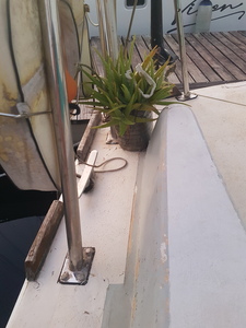 LeMoko:Je vais un peu rejoindre la solution de ton copain. Sauf erreur le pont n'est pas en totalité en sandwich. Justement le bord du pont. Tu retires sur +/- 5cm de rail de fargue et à la place du pose une équerre en inox fixé sur le bord du pont et verticalement dans la coque avec contre plaque et tu soudes ton balcon dessus. Attention de laisser un espace entre inox et alu ( électrolyse).·le 16 nov. 18:24