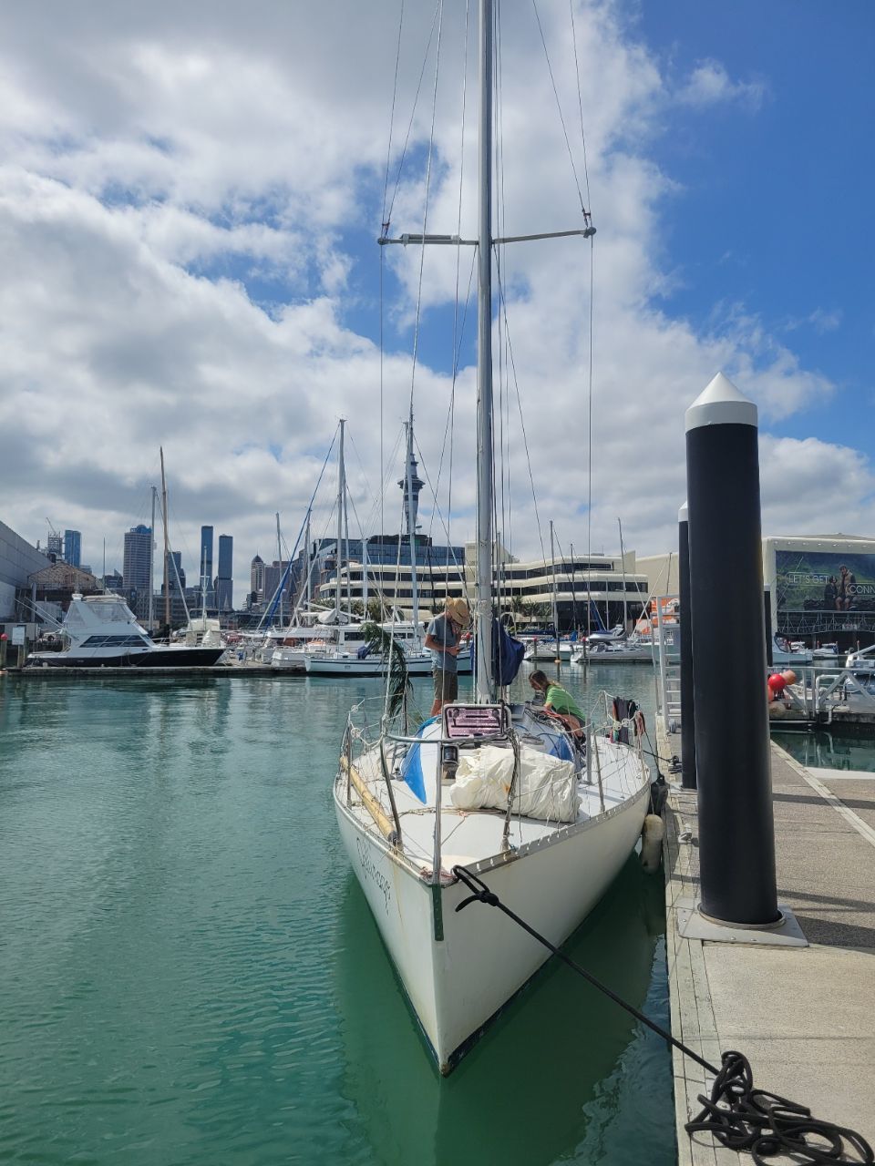 "La préparation d’une traversée commence à devenir familière. Pas tout à fait une habitude, quand même. D’autant que l’immense Pacifique devant nous, ajoute un nouveau petit défi : embarquer suffisamment d’eau. 3 litres par jour et par personne, 5300 milles jusqu’à Puerto Montt, une traite quotidienne moyenne de 150 milles… On monte vite à un demi mètre cube d’eau douce en cale ! Hier après midi nous avons traversé Auckland, Méli, Juju et moi – marche, train, bus – pour aller chercher 4 fûts de 60 litres. De quoi compléter sereinement la pyramide de bidons « normale » de Gallinago.