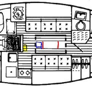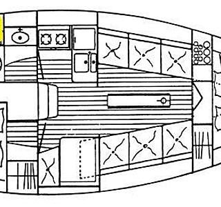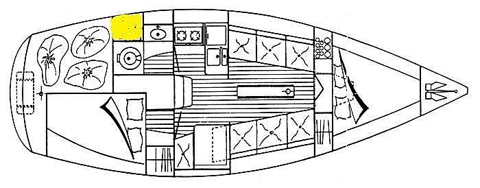 Pour moi , ici (en jaune ) dans un bidon plastique (bidon 20l genre kerdane ) dont le dessus a été découpé et coiffé d'un couvercle .Une planchette fixée entre le meuble lavabo et la cloison AR empêche le bidon de "voyager seul à la gite " Un sac poubelle dans le bidon . Plus un deuxième bidon genre" pour kayac" dans le coffre de cockpit pour y stocker un sac poubelle plein si pas de port pendant plusieurs jours . Mais on peut sûrement faire autrement aussi .